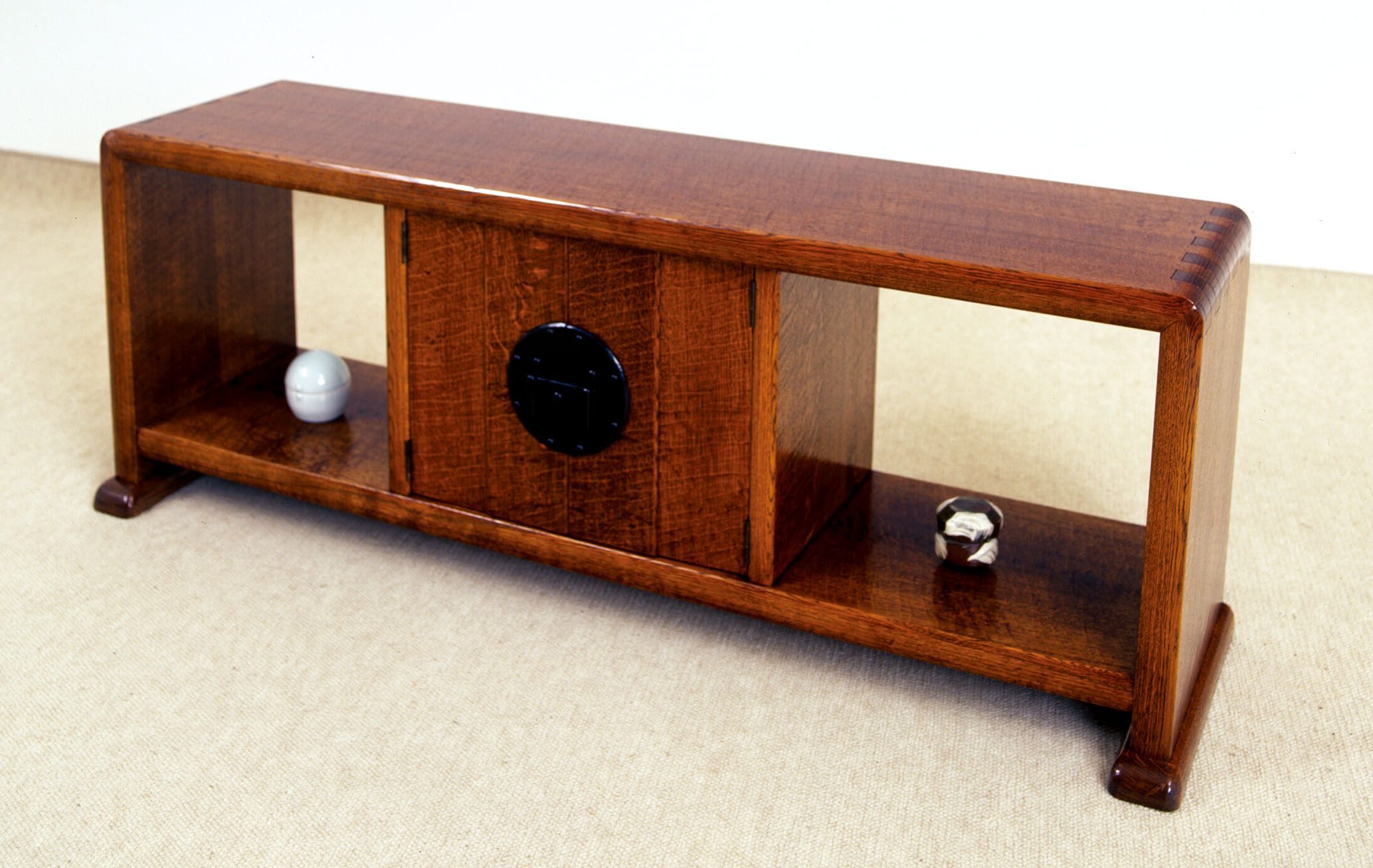 和室に置いて丁度いい高さになっています。ポイントとなっている丸い止め金具は、自家製の鉄金具で、錆止めに漆焼付けをしています。W1370 D37.5 H51 cm楢、凸凹削り、拭漆仕上げ