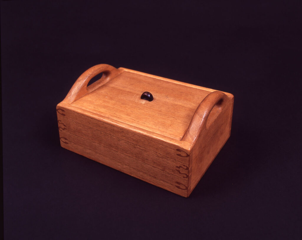 用途が針箱ですので、組み手は和鋏と洋鋏をデザイン化しました。素朴な作品ですが、こういう実用的な作品こそ大事にしていかなければいけないと思っています